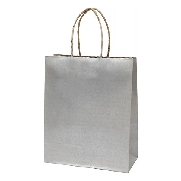 Ajándéktasak, M 22x25x10 cm méretben, ezüst színben, sodort füles.