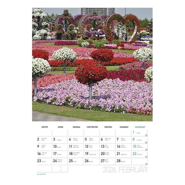 B4 méretű (álló formátum), spirálozott képes falinaptár, 12 hónap, ünnepekkel, névnapokkal, fém akasztóval, 235x330 mm